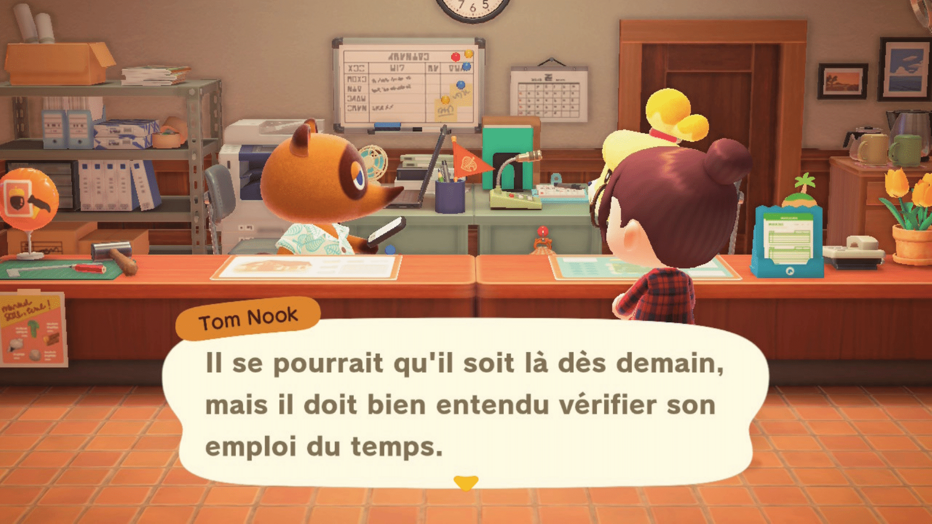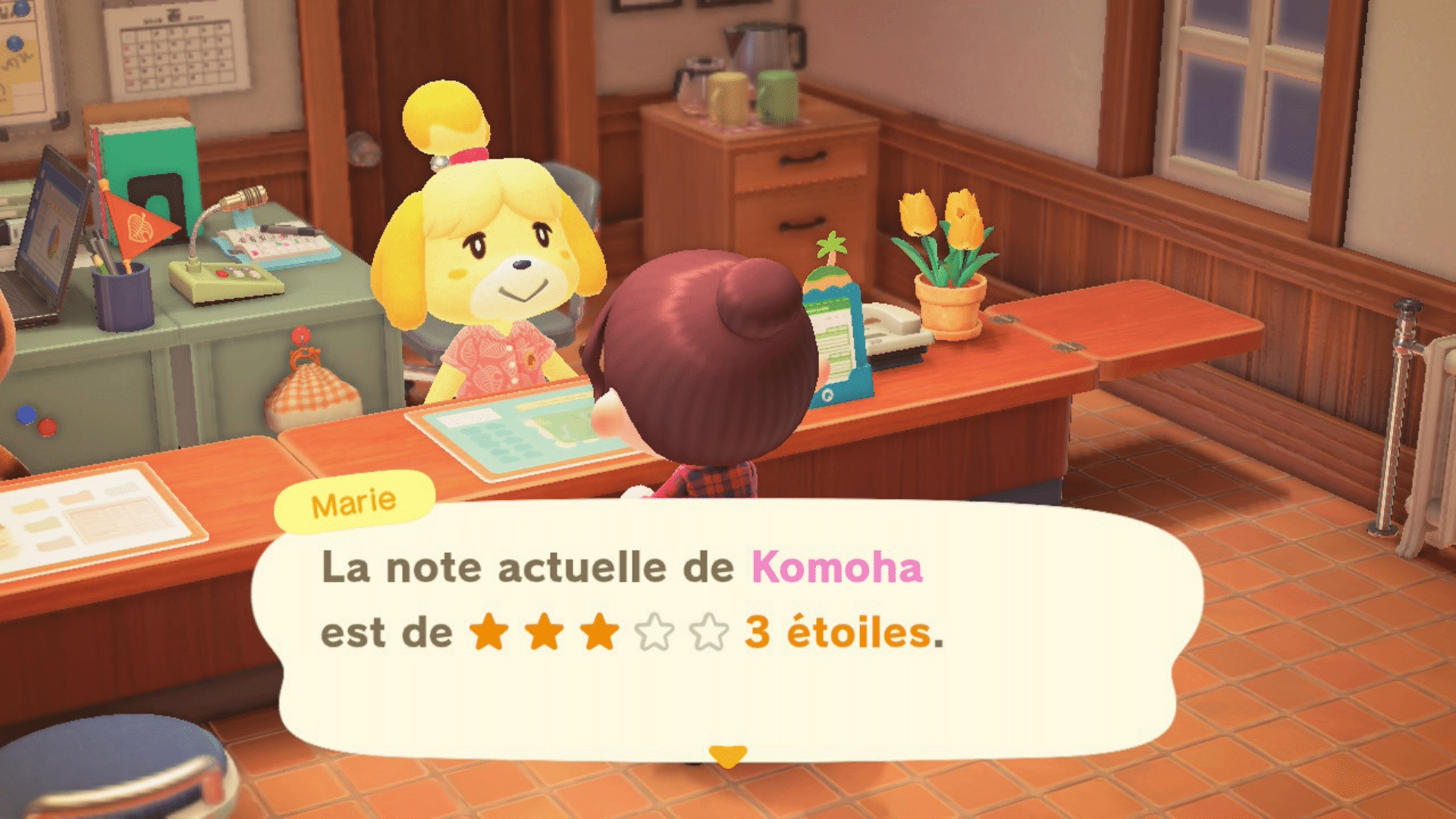 Faites des essais, et allez reparler à Marie pour connaître votre réputation. Une fois que vous êtes à 3 étoiles, Marie vous lit un avis d’un certain K.L. Le fan incontesté qu’est Tom Nook réagit immédiatement tel un fan boy et vous explique ce qui va se passer ensuite.