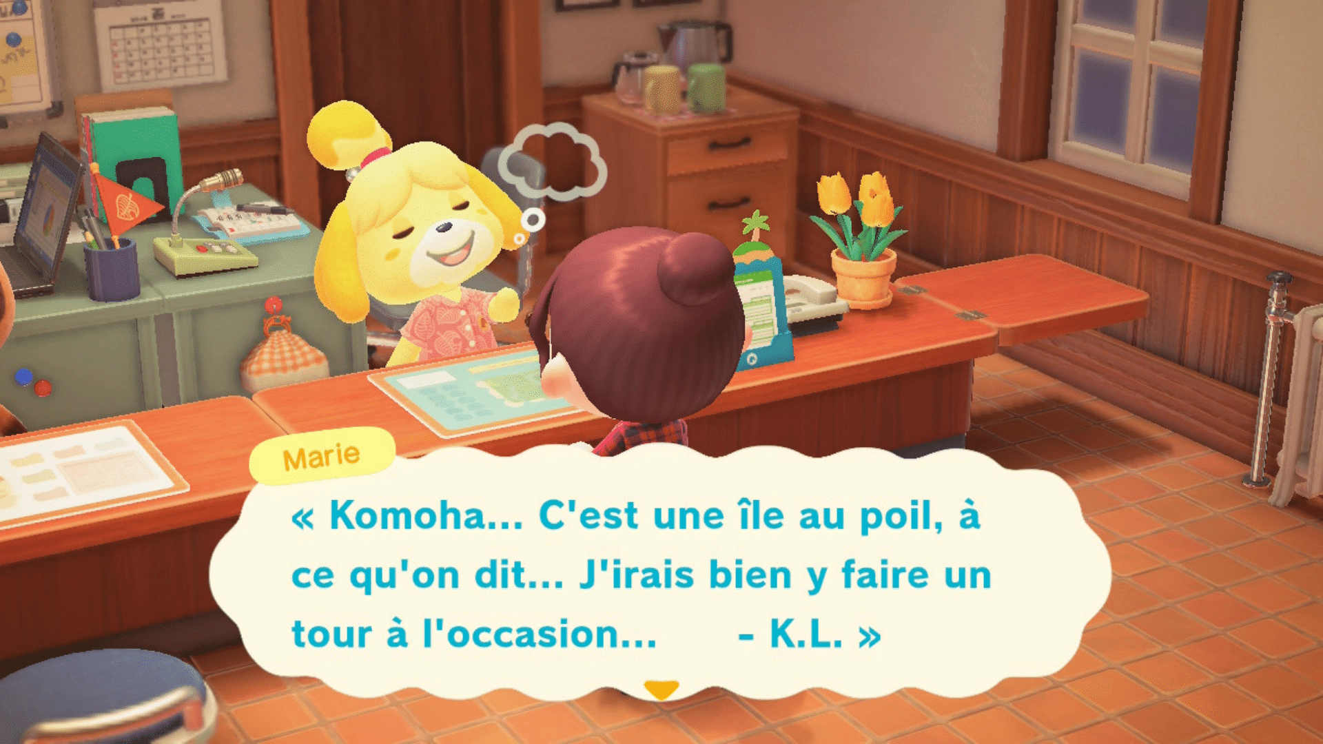 A partir de ce moment là, Marie vous expliquera ce qu’il va falloir faire pour embellir votre île. En lui parlant, sélectionnez « La réputation de l’île » pour connaître le nombre d’étoiles sur 5 que vous avez. Il faudra atteindre 3 étoiles de réputation pour mener à bien le projet K.